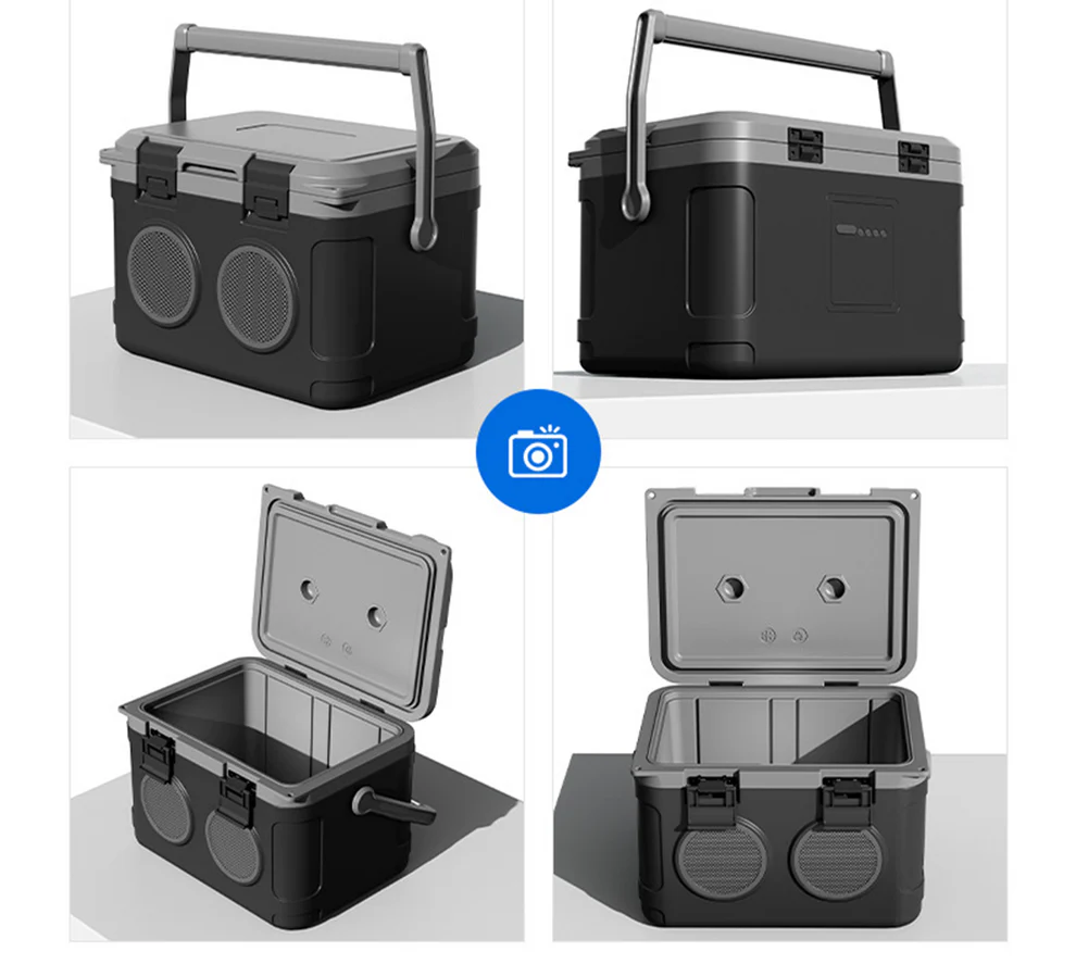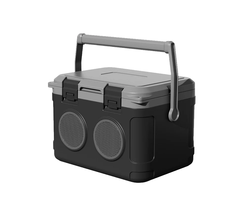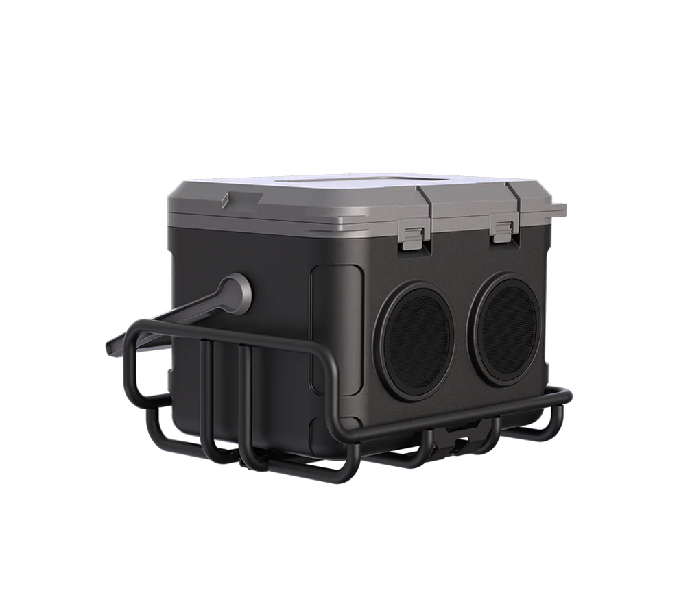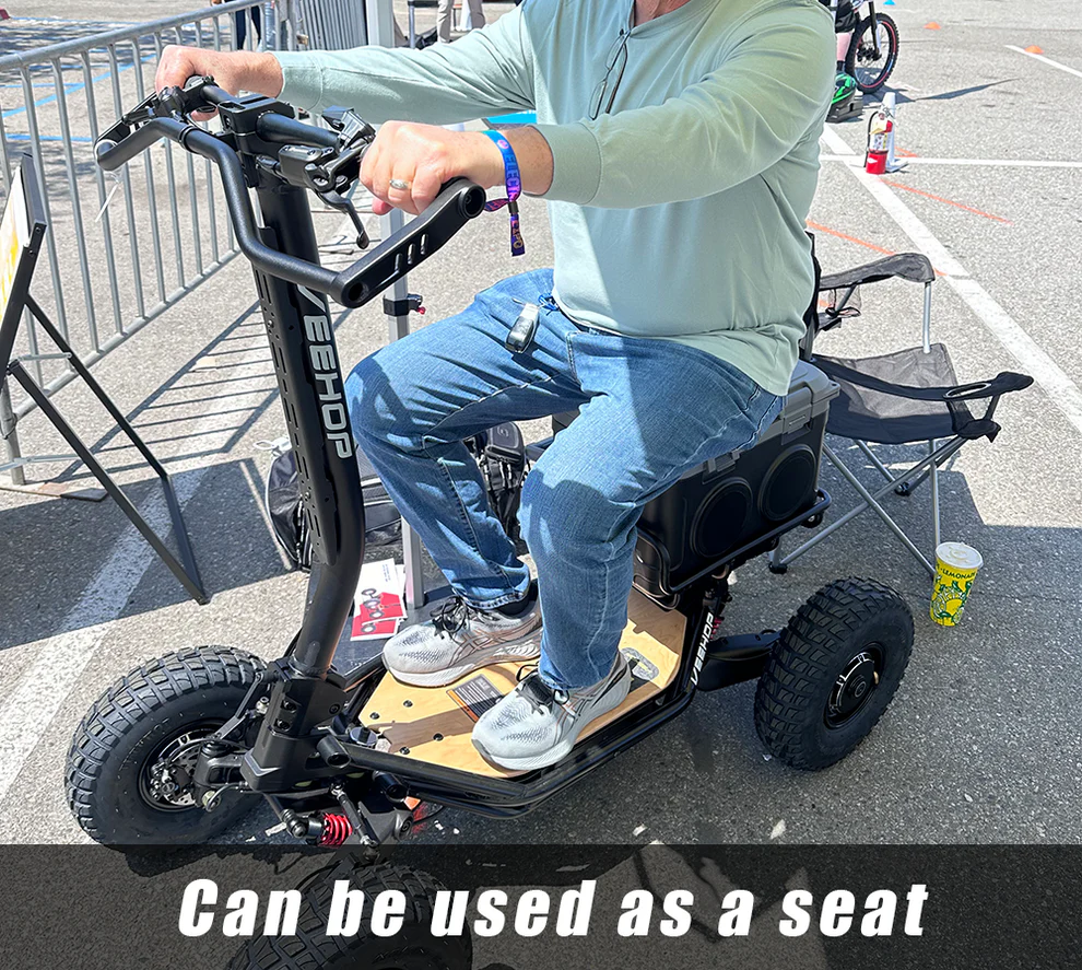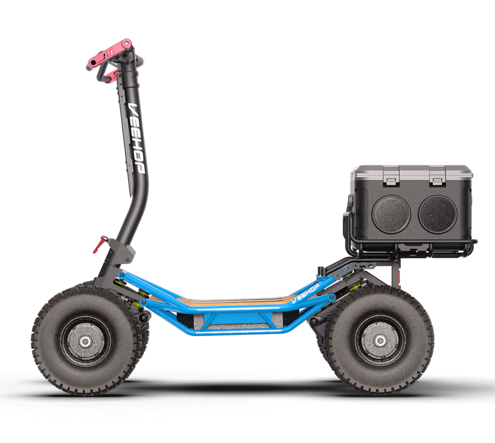 A Cooler box that attaches to the Veehop scooter as an accessory. The Cooler has built in bluetooth speakers and can also be used as a seat.