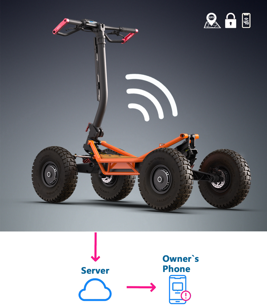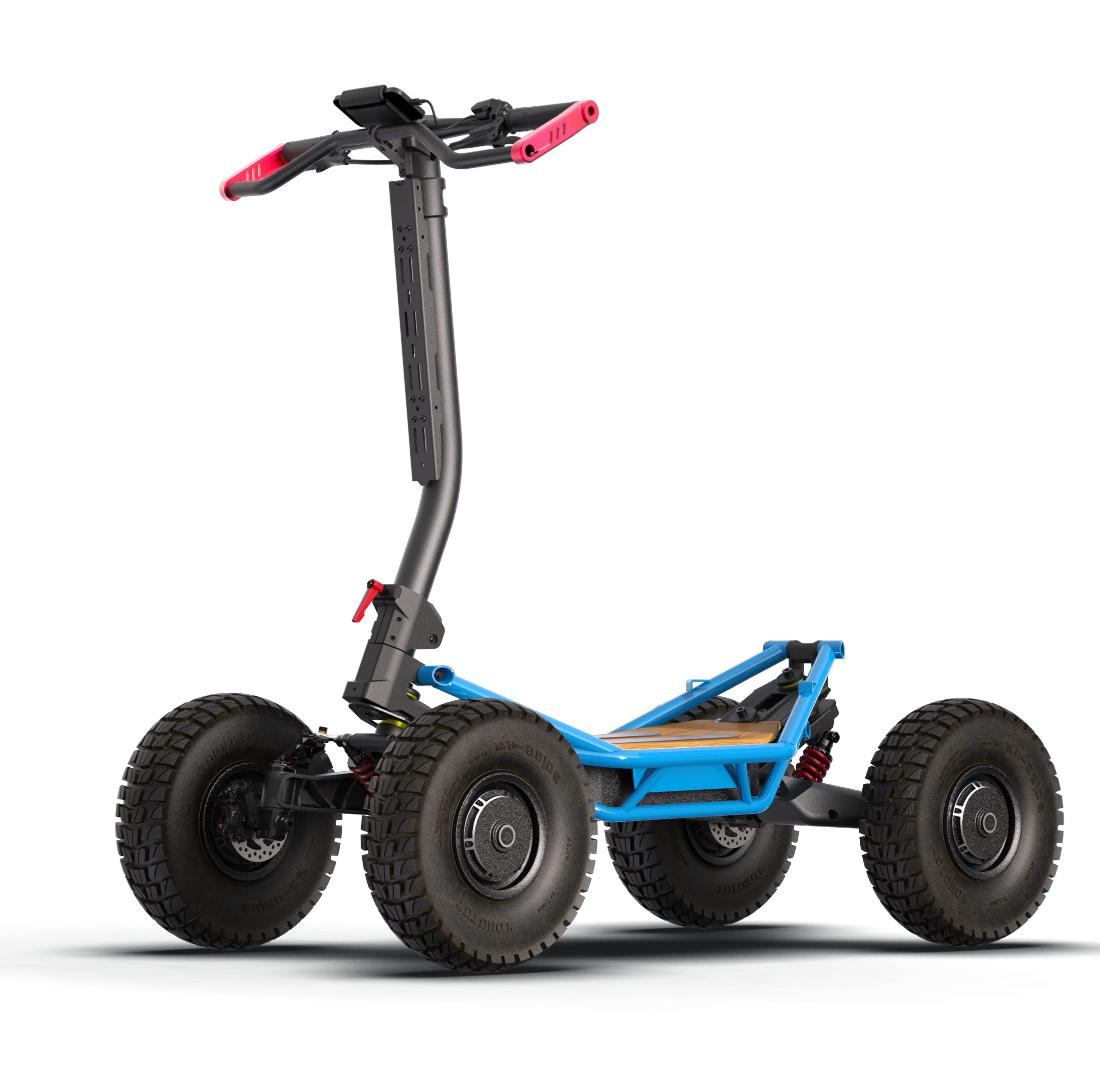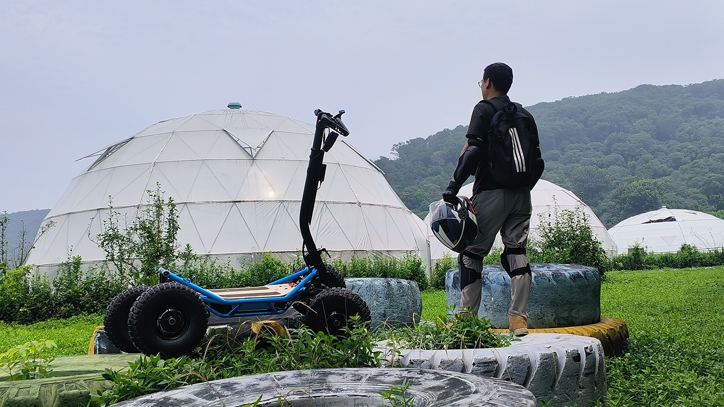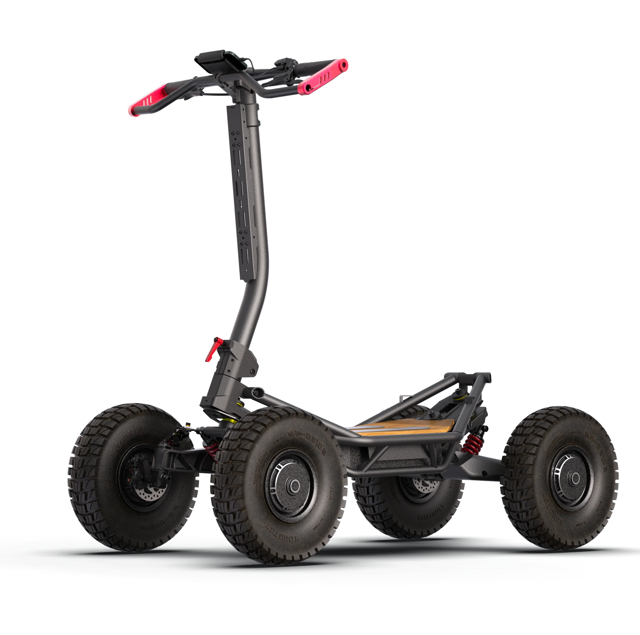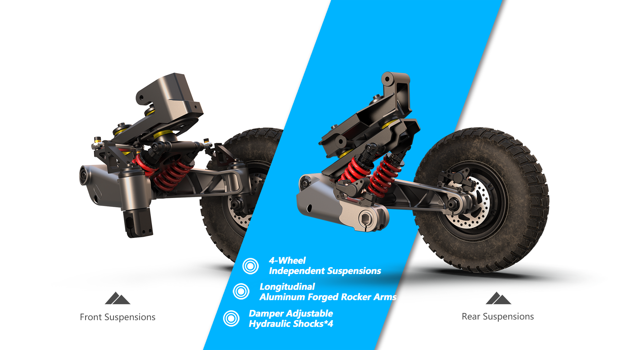4 - Wheel Independent Suspension: The Veehop is equipped with a 4-wheel independent suspension system, front and rear longitudinal aluminium alloy swing arms, and hydraulic shocks. The 4 wheels are capable of providing an effective suspension travel range of 116mm-216mm individually. This ensures a comfortable and reliable off-road experience for users across various terrains