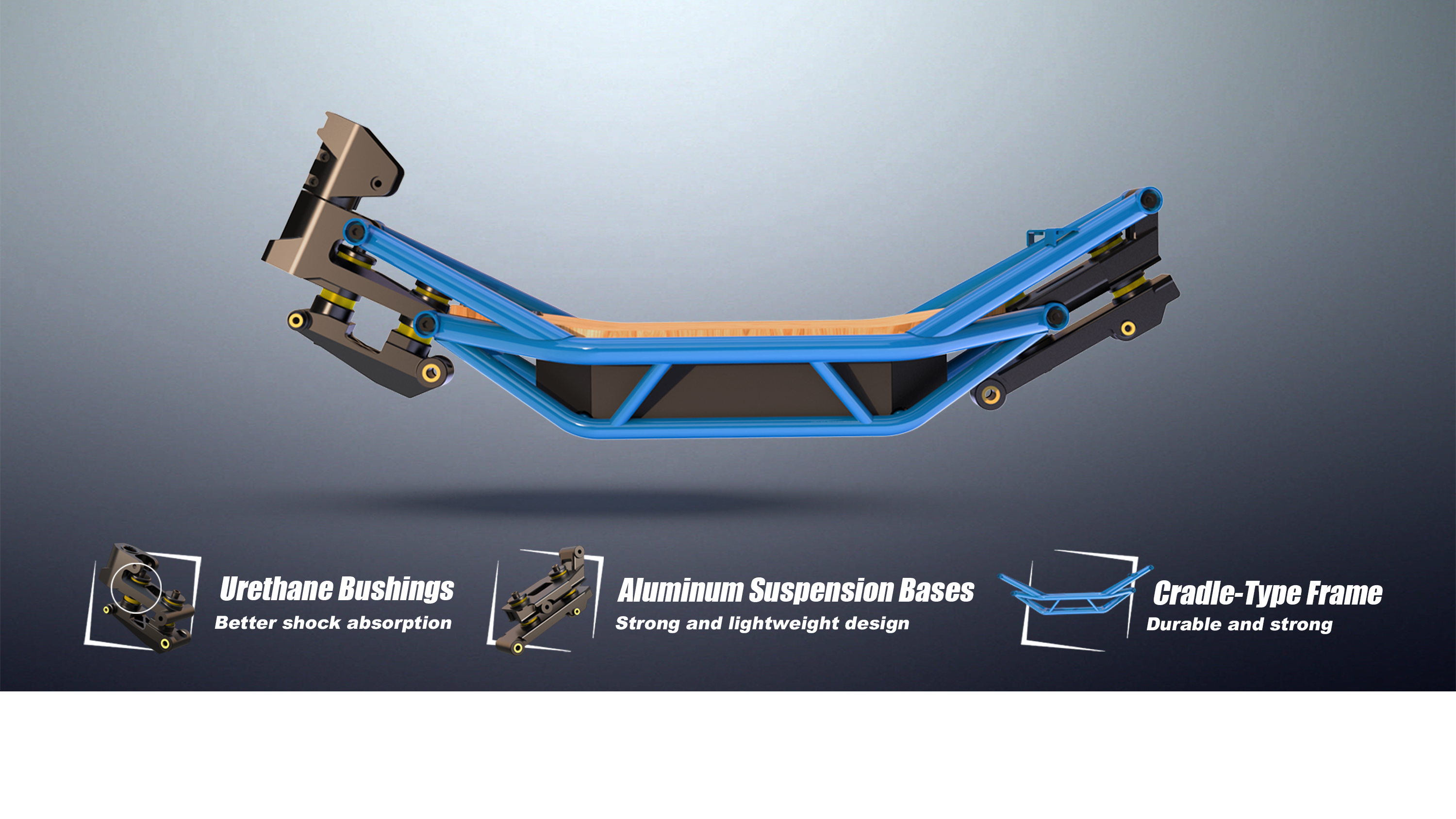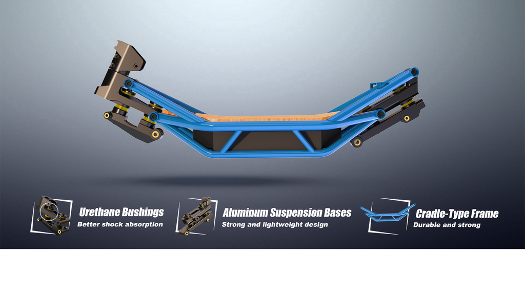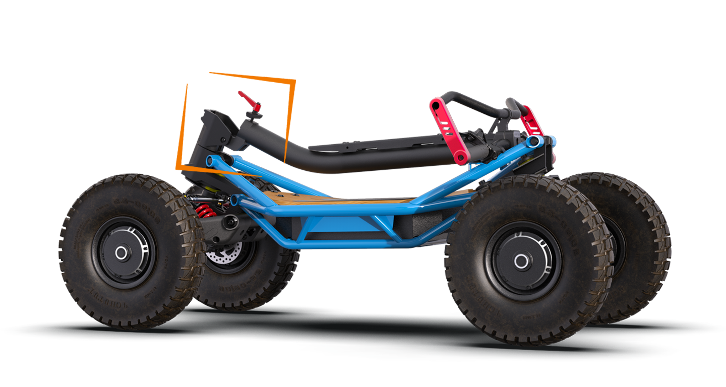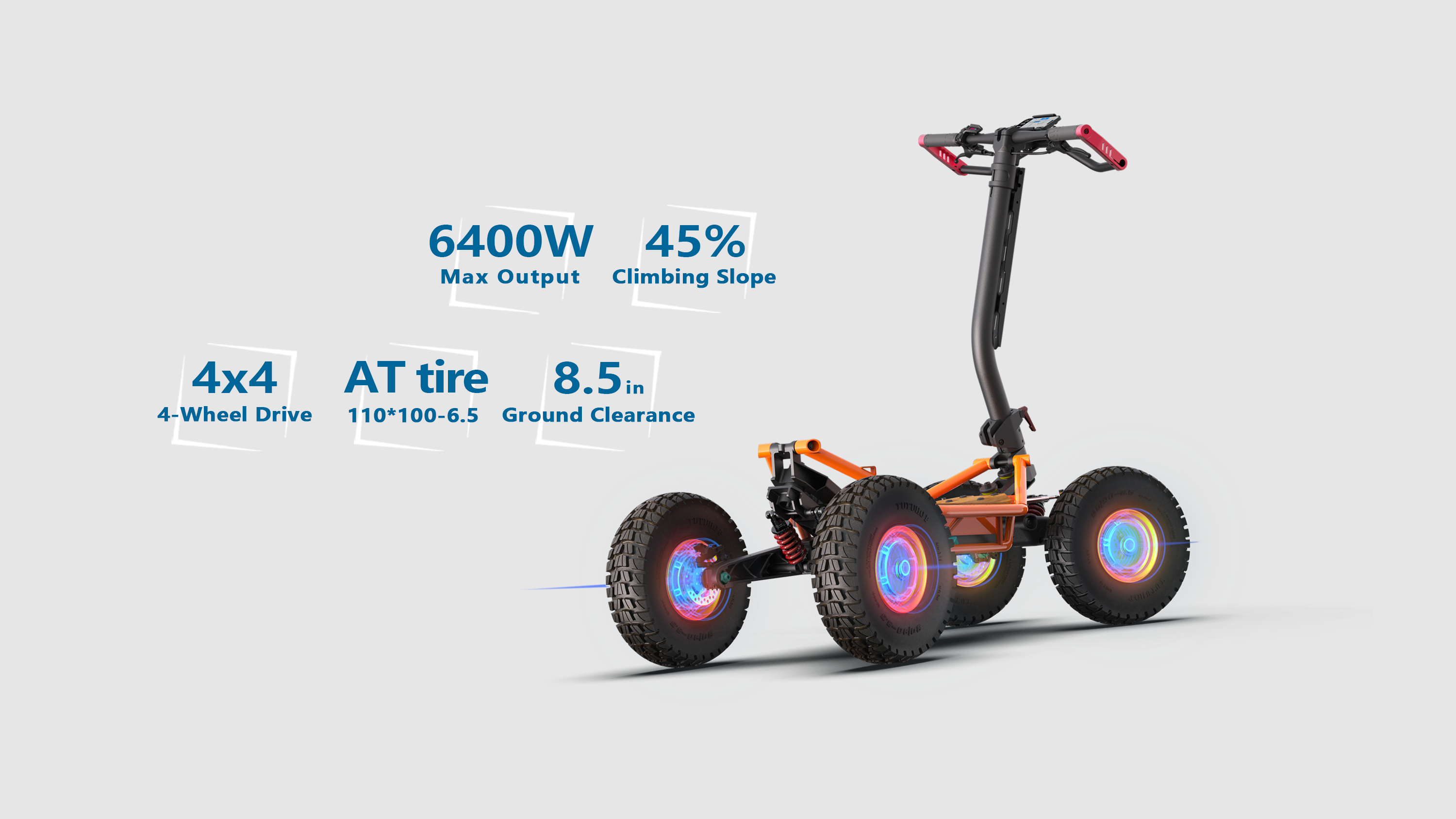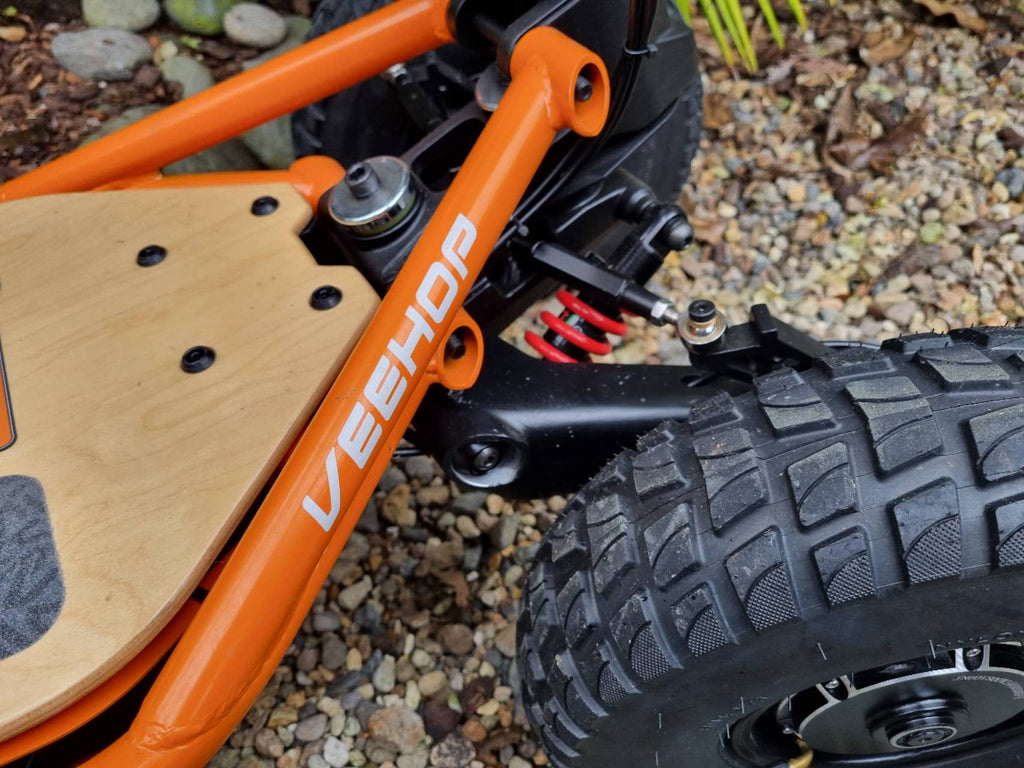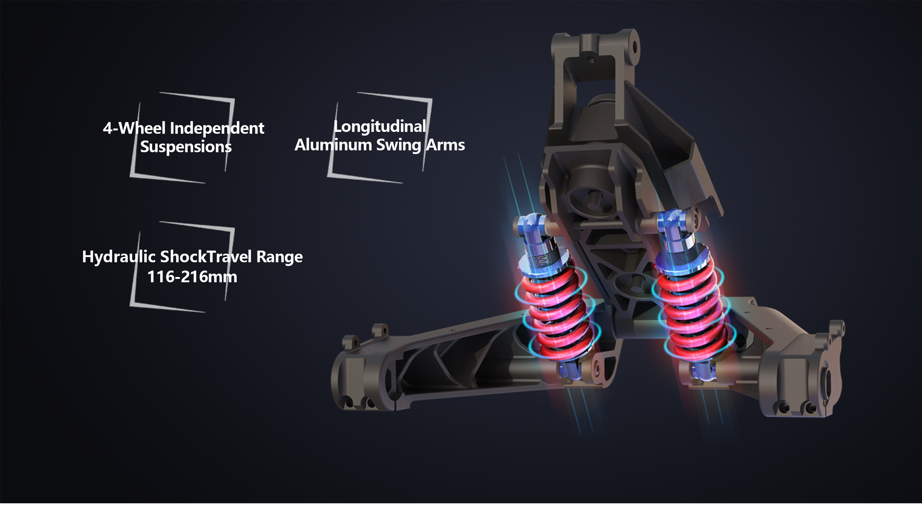 4 - Wheel Independent Suspension: The Veehop is equipped with a 4-wheel independent suspension system, front and rear longitudinal aluminium alloy swing arms, and hydraulic shocks. The 4 wheels are capable of providing an effective suspension travel range of 116mm-216mm individually. This ensures a comfortable and reliable off-road experience for users across various terrains